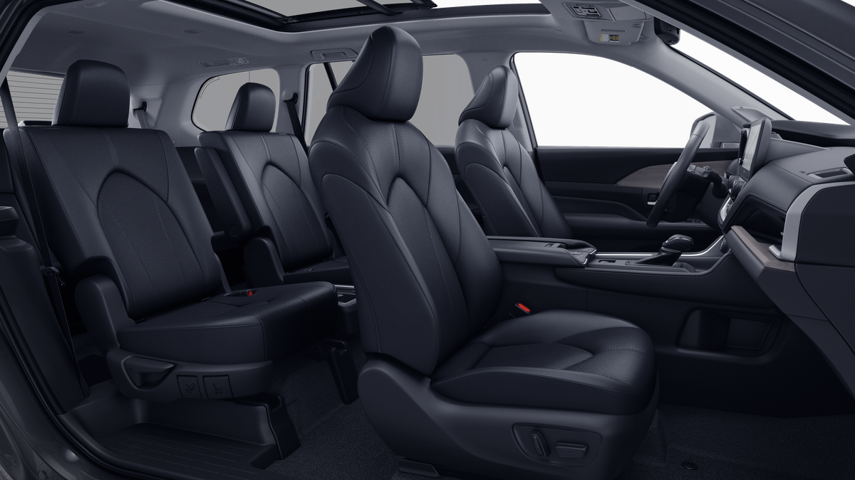 • 7-passenger seating with second-row fold-down captain's chairs and fold-down inboard armrests, adjustable headrests and two cup holders mounted on the floor; and 60/40 split, fold-down third-row seats with sliding headrests and recline function