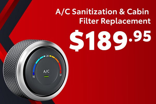 Plus tax and applicable fees. Includes A/C evaporator treatment and cabin filter replacement. May not be combined with other offers. Must present coupon at time of write-up. See dealer for details.